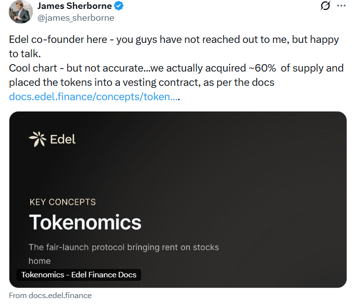 Bulgulara yanıt veren Edel Finance kurucu ortağı James Sherborne, ekibin token arzının %60’ını almayı planladığını ve bunun daha sonra hak sahipliği anlaşmalarına bağlanacağını söyledi.