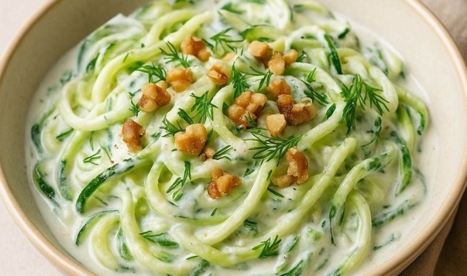 Diyetlerin veya glutensizin favori haline gelen “Zoodles”, yoğurt sosu ve ceviz ile kabak, sos ve cevizden yapılmış spagetti ile birleştirilirse hafif ama tatmin edici bir akşam yemeğine dönüşür. Sadece 10 dakika içinde hazırlanabilen bu tarif, sıcak yaz günlerinde ferahlatıcı ve besleyici bir seçenek sunar.